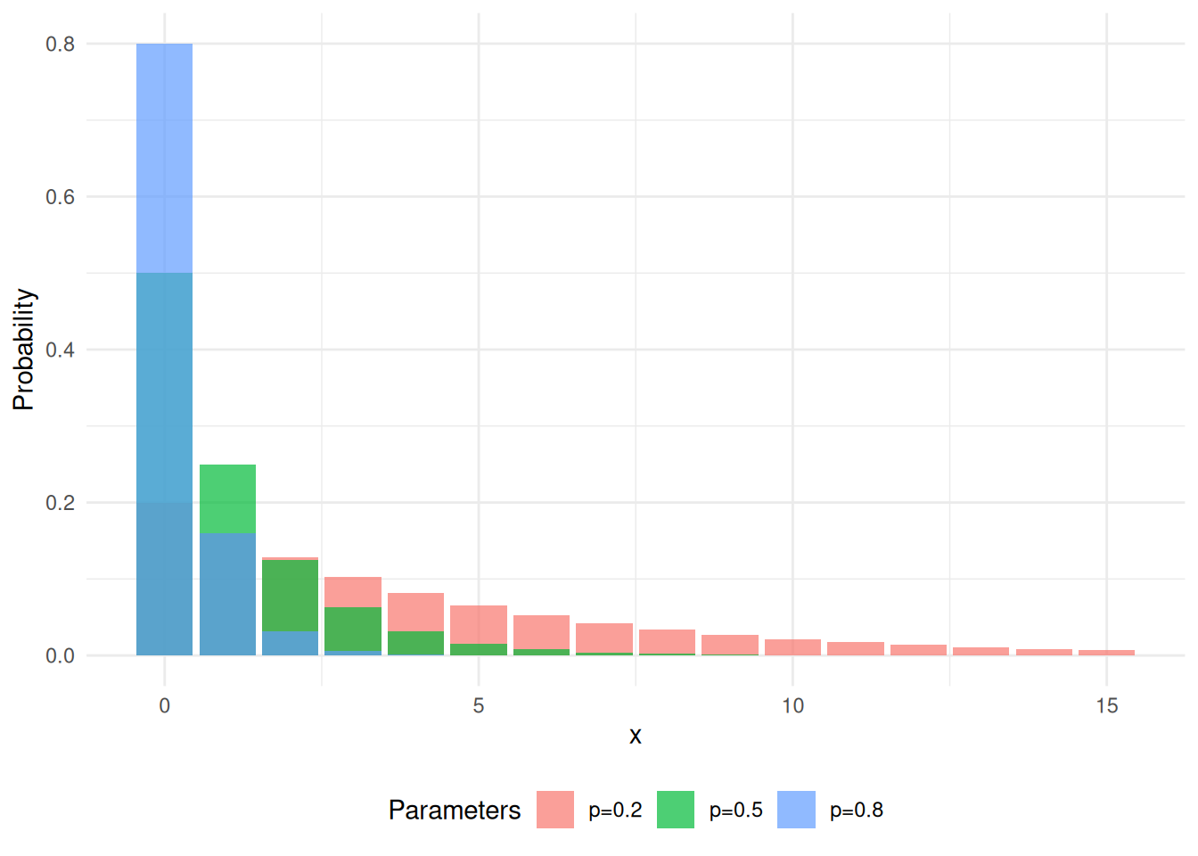 The geometric distribution models the number of independent Bernoulli trials needed to obtain the first success, where each trial succeeds with probability \(p\). It is the discrete analogue of the exponential distribution and shares the memoryless property.