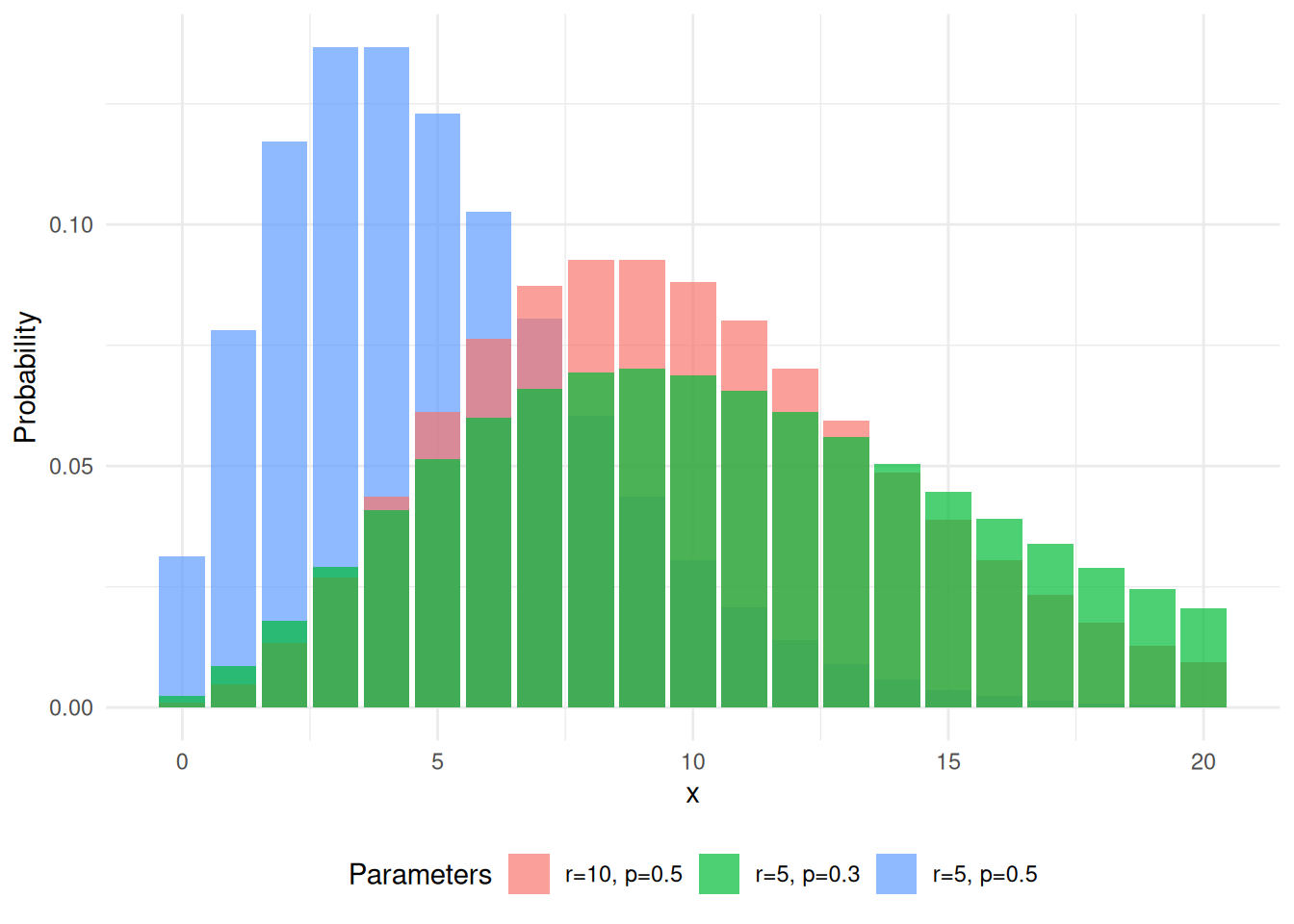 Consider an experiment of independent Bernoulli (see Section A.1) trials, each with probability \(p\). If we are interested in when we have \(r\) successes consider the Negative Binomial distribution \[ X \thicksim\operatorname{NegBin}\left(r, p\right) \]