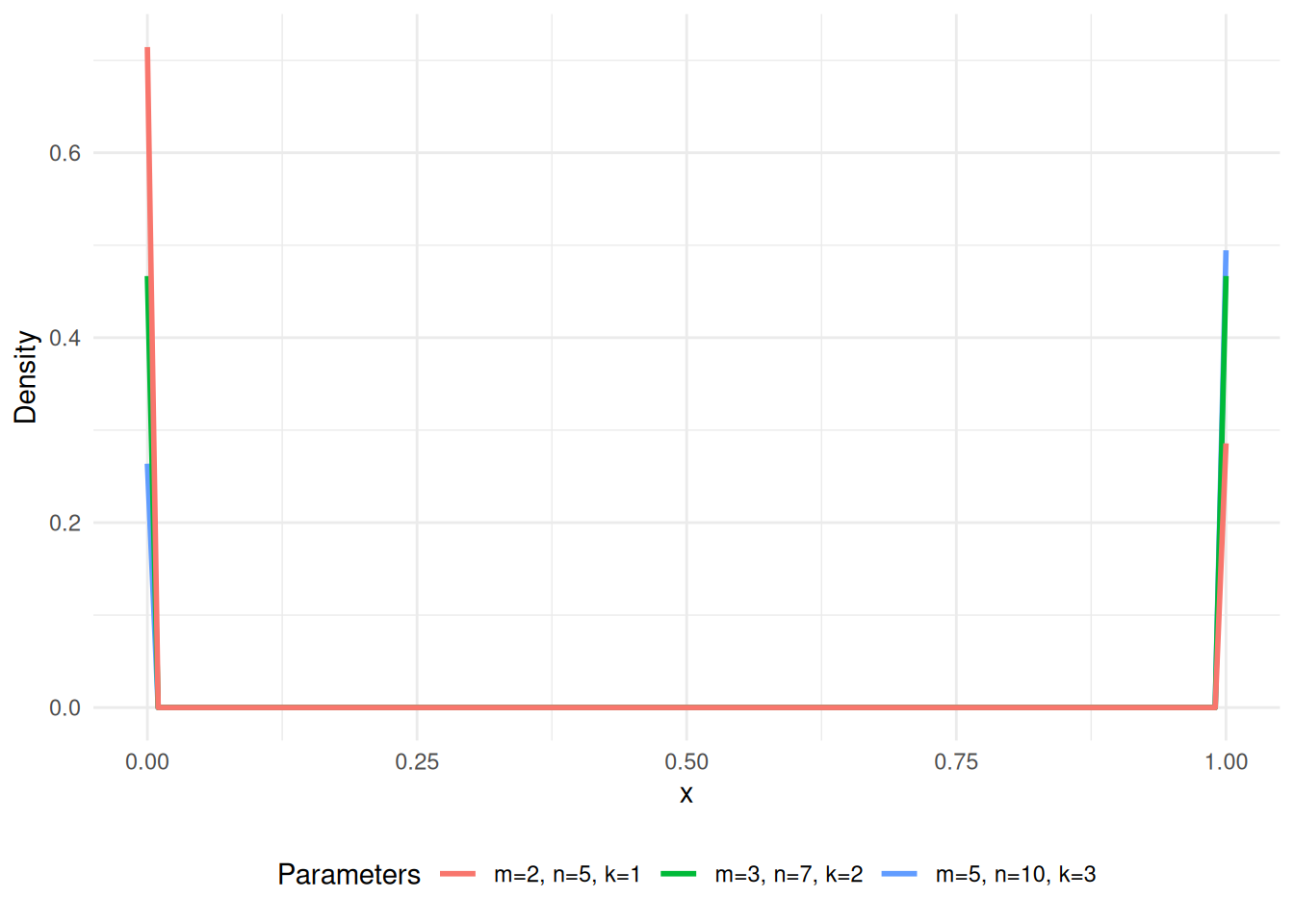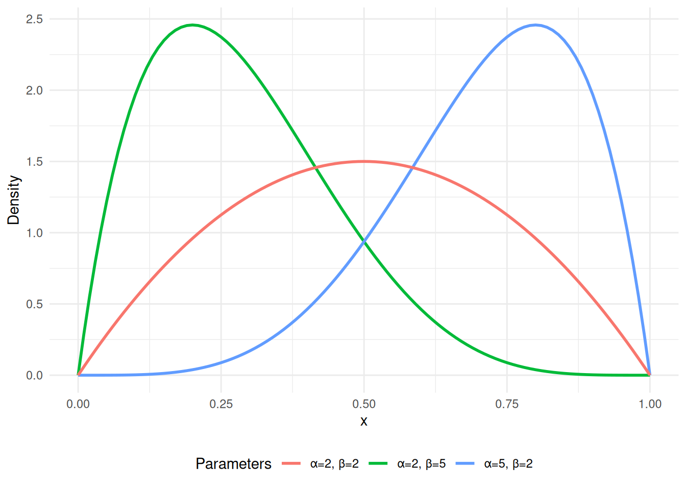 The beta distribution is a continuous distribution defined on the interval \([0, 1]\), making it well-suited for modeling probabilities or proportions. It is parameterized by two positive shape parameters \(\alpha\) and \(\beta\) that control the shape of the distribution, ranging from uniform to strongly skewed or U-shaped.