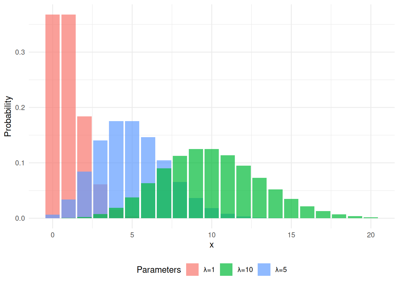 The PMF (see Section 2.1) is given as \[ p_X(x) = \frac{\lambda^x}{x!}\operatorname{exp}\left(-\lambda\right) \]