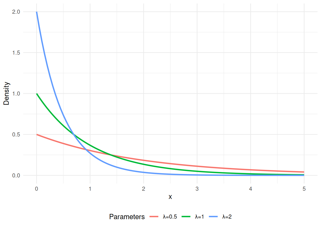 The exponential distribution models the time between events in a Poisson process, i.e., the waiting time until the next independent event occurs at a constant rate \(\lambda > 0\). It has the memoryless property: the probability of waiting an additional time \(t\) does not depend on how long one has already waited.