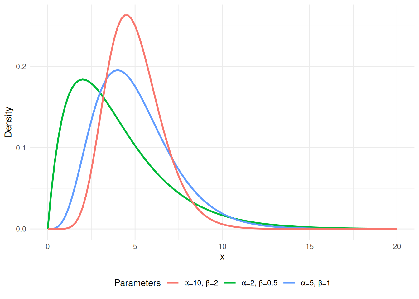 The gamma distribution is a flexible two-parameter family of continuous distributions that generalizes the exponential distribution. It models the waiting time until the \(\alpha\)-th event in a Poisson process, and includes the chi-square and exponential distributions as special cases. \(X \thicksim\operatorname{Gamma}\left(\alpha, \beta\right)\), where \(\alpha > 0\) is the shape parameter and \(\beta > 0\) is the rate parameter.