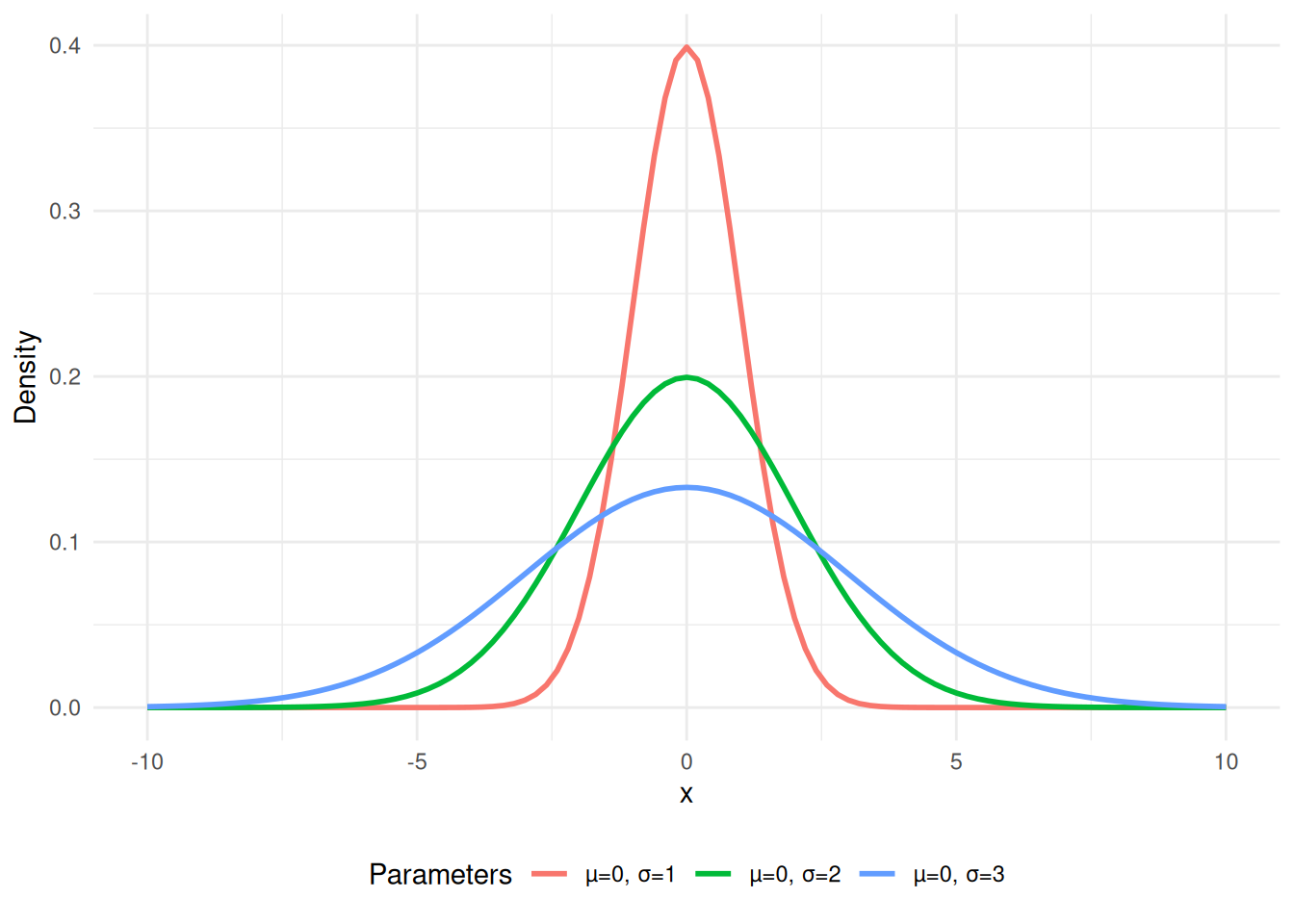 The PDF (see Section 2.3) is given as \[ f_X(x) = \frac{1}{\sqrt{2 \cdot \pi} \cdot \sigma} \cdot \operatorname{exp}\left(- \frac{1}{2 \cdot \sigma^2}\left(x - \mu\right)^2\right) \]