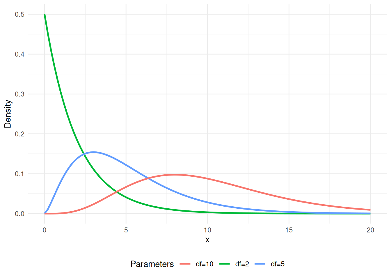 The chi-square distribution is a special case of the gamma distribution and arises as the distribution of the sum of squares of \(k\) independent standard Gaussian random variables. It is widely used in hypothesis testing (e.g., goodness-of-fit tests) and in the construction of confidence intervals for variance. \(X \thicksim\operatorname{Gamma}\left(\frac{k}{2}, \frac{1}{2}\right)\), \(k \in \mathbb{N}\).